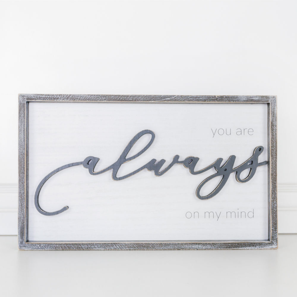 This chic wood framed sign (Product Number 10943) uses a pretty combination of white and grey colors and displays, "You Are Always On My Mind" which makes it a great medium in expressing sympathy and love to a departed loved one. It has dimensions of 20" by 12" by 1.5" and would look great hanging on your wall or standing on your desk. Designing home and holiday decors since 2002, Adams & Co has shown the world its unique style and conventional flair that can bring you any home or office theme you want to achieve.