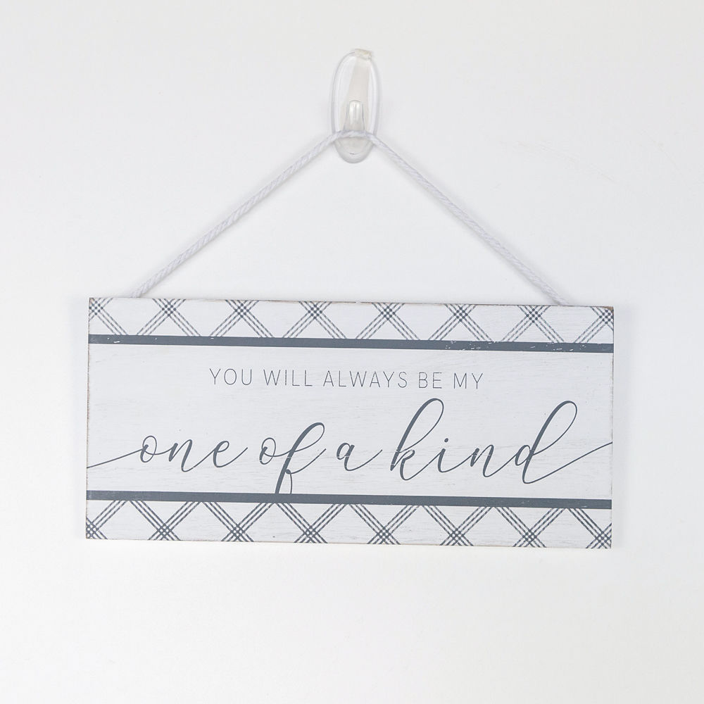 Decorate your home with Adams & Co's creative décors! This wood tile (Product Number 11047) displays a lovely message saying, "You Will Always Be My One Of A Kind". It is 11" wide, 5" high, and .25" thick and it can look great hanging on your room. Using the versatile colors of grey and white, this wood tile complements well with a wide range of home and office decors. Designing home and holiday decors since 2002, Adams & Co has shown the world its unique style and conventional flair that can bring you any home or office theme that you want to achieve.