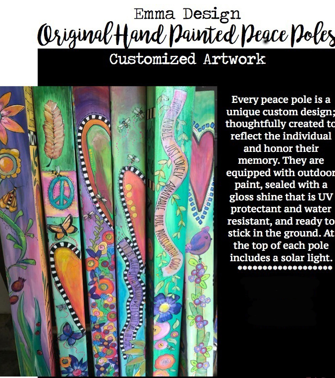 Peace Poles Custom Made. They come in 1 ft tall - $144, 2 ft tall - $180, 3 ft tall - $240, or 4 ft tall - $300. Every peace pole is a unique custom design; thoughtfully created to reflect the individual and honor their memory. They are equipped with outdoor paint, sealed with a gloss shine that is UV protectant and water resistant, and ready to stick in the ground. At the top of each pole includes a solar light. The 1 ft pole does not have a solar light but comes with a detachable stake and a post cap.