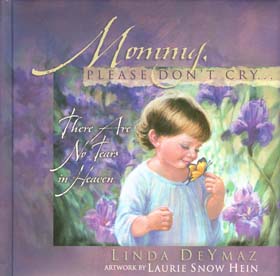 Mommy, Please Don't Cry...There Are No Tears in Heaven by Linda Deymaz and artwork by Laurie Snow Heain. In a moment's time your world shatters...time stands still and darkenss overwhelms the soul. Our stories are different but our pain is the same. Mothers who will forever grieve the loss of a child. Yet beyond the darkness, there is light and comfort for our broken hearts. This is a book of hope and healing. Adorned with beautiful illustrations, the gentle, poignant words express the lov