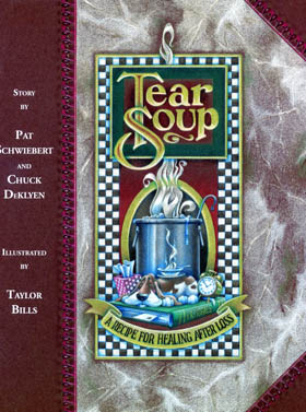 Tear Soup; A Receipe for Healing After Loss by Pat Schwiebert and Chuck DeKylen, illustrated by Taylor Bills. In this richly illustrated book, Grandy has just suffered a big loss in her life, and so she is cooking up her own unique batch of "tear soup." Tear Soup gives you a glimpse into Grandy's life as she blends different ingredients into her own grief process. Her tear soup will help to bring her comfort and ultimately help to fill the void in her life that was created by her loss. Following Grandy's story you will find tips to use in dealing with grief: If you are the cook, If your friend is the cook, Soup making and time; If a child is the cook, If you are a male chef, If there are two of you cooking. Tear Soup affirms the bereaved, educates the unbereaved, is a building block for children. Hardcover -51 pages.