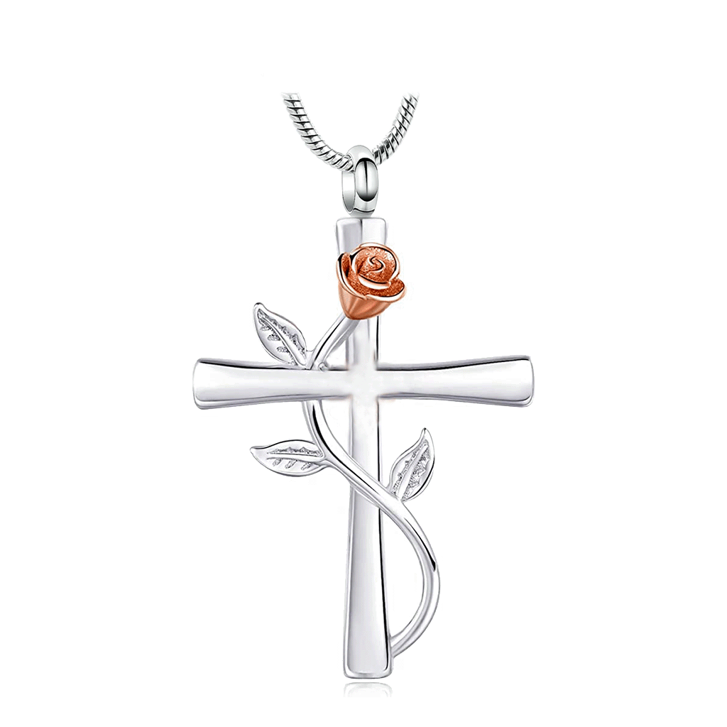Cremation Jewelry - J-610 Cross with Vine and Rose Flower - Pendant with Chain