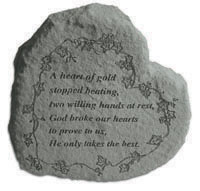 Message: A heart of gold stopped beating, two willing hands at rest, God broke our hearts to prove he only takes the best. Concrete, heart shaped stone. 12" x 12" - 16 lbs.