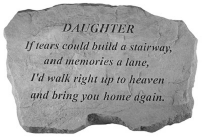 Honor the memory of your beloved daughter with this beautifully crafted memorial stone. Featuring the heartfelt inscription, "If tears could build a stairway, and memories a lane, I'd walk right up to heaven and bring you home again," this stone serves as a touching tribute to the love and joy she brought into your life. Made from durable materials, it’s perfect for placing in a garden, at a gravesite, or in your home, allowing you to keep her spirit close. Celebrate her life and cherish the memories with this meaningful keepsake.