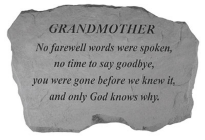 Honor the memory of your beloved grandmother with our beautifully crafted memorial garden stone. Featuring the heartfelt inscription, "No farewell words were spoken, no time to say goodbye, you were gone before we knew it, and only God knows why," this stone serves as a touching tribute to her life and legacy. Made from durable materials, it’s perfect for placing in your garden or a special spot that reminds you of her love. Celebrate her memory and keep her spirit alive in a place where you can reflect and remember.