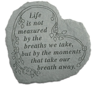Message: Life is not measured by the breaths we take, but by the moments that take our breath away. Concrete, heart shaped stone. Dimensions: 12" x 12" Weight: 16 lbs.
