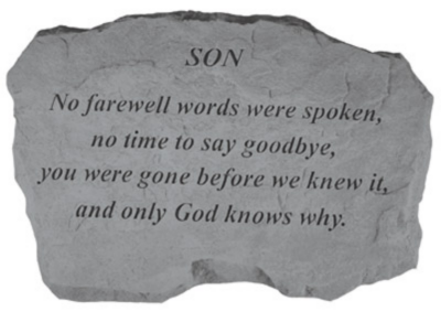 Honor the memory of your beloved son with this beautifully crafted memorial garden stone. Featuring the heartfelt inscription, "No farewell words were spoken, no time to say goodbye, you were gone before we knew it, and only God knows why," this stone serves as a touching tribute to a life cherished. Made from durable materials, it’s designed to withstand the elements while adding a serene touch to your garden or outdoor space. Create a peaceful spot for reflection and remembrance, ensuring that his spirit lives on in a place of beauty and tranquility.
