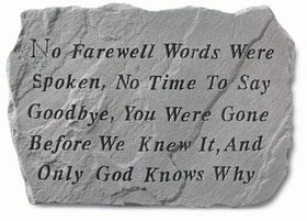 Kay Berry - No Farewell Words Were spoken, no time to say goodbye, you were gone before we knew it, and only God knows why. 18.5" x 12.25", 18lbs.