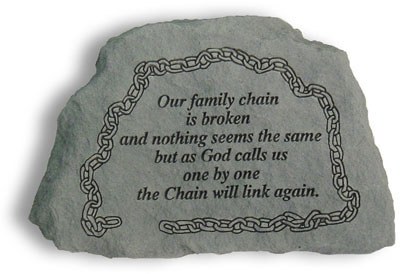Engraved with a broken chain around the edge of the stone. Message: Our family chain is broken and nothing seems the same but as God calls us one by one the Chain will link again. Dimensions: 6.5" x 4.5" Weight: 1.25 lbs