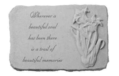 Honor the memory of a loved one with this beautifully crafted memorial stone with a gorgeous iris and engraved with the phrase: "Wherever a beautiful soul has been there is a trail of beautiful memories." This garden stone serves as a heartfelt tribute, bringing a touch of serenity and beauty to any outdoor space. Made from durable materials, it withstands the elements while providing a lasting reminder of cherished moments. Place it in your garden or a special spot to create a peaceful sanctuary for reflection and remembrance. Wherever a beautiful soul has been there is a trail of beautiful memories.