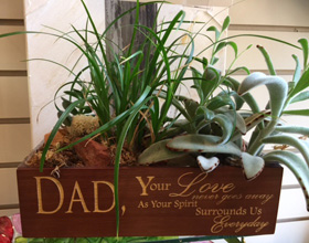 Customized wooden planter filled with beautiful succulents. You select the relationship and dates. Verse reads: Your Love never goes away as your spirit surrounds us everyday. Created by Kevin at Flowers by Anthony.