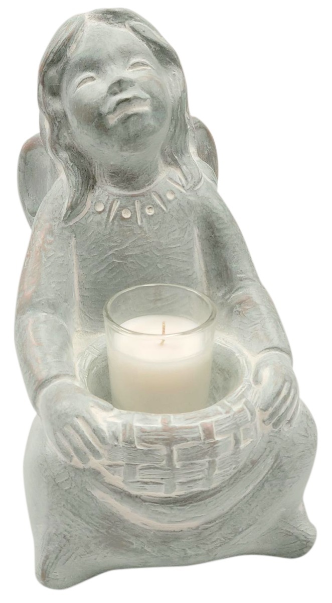 Sitting serenely, with a basket in her lap, this sweet angel is a perfect gift to give in Sympathy or Thinking of You. She comes with a small votive candle.