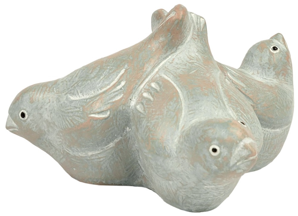 A simple yet elegant design of 3 birds, huddling together. Cast and finished in Weathered Bronze, perfect for your outdoor or indoor table. Sit it atop our Leaf Base, for a functional garden piece.